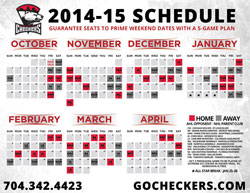 The Checkers' longest homestand is their last of the regular season, a six-game stretch over two and a half weeks at the end of March/beginning of April that closes out their home schedule. That goes along with two other five-game homestands, one of which is earlier in March, which should help the team establish momentum and avoid the fatigue associated with traveling. The longest road trip Charlotte will face this season is a six-game stretch in late March that takes them through Oklahoma City, San Antonio, Iowa and Norfolk.Unlike last year, there will not be any double-headers with the Charlotte Hornets, nor will there be any games in Raleigh. All Checkers home game will be held at Time Warner Cable Arena.